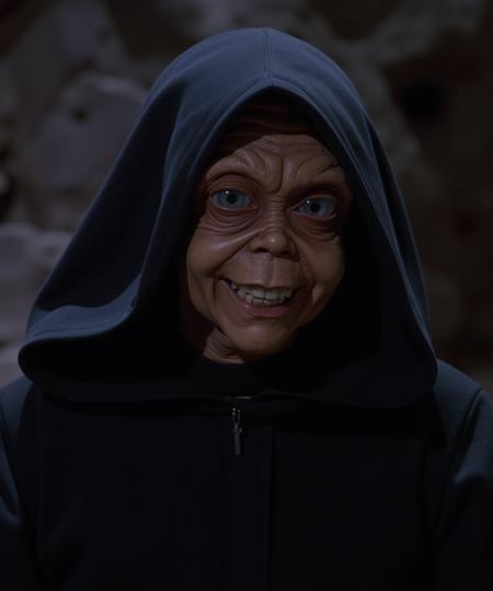 - cinematic scene from star wars, mac the alien as the emperor palpatine, wearing a dark hood and evil smile on his face,