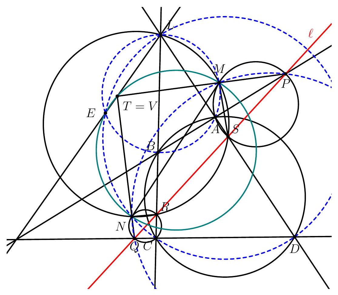Therefore, since $\omega$ meet $t$ at $T, V$, and $E$, either $T=V$ if both $T \neq E$ and $V \neq E$ or $T=V=E$. At any rate, the intersection of lines $M P$ and $N Q$ lies in $t$.