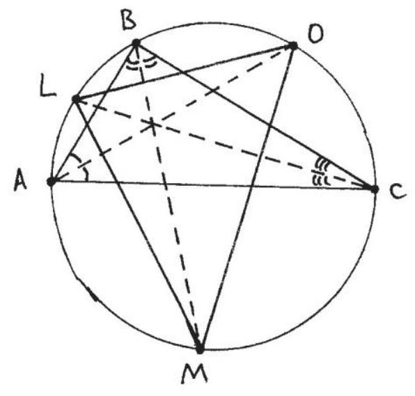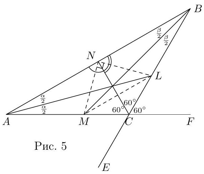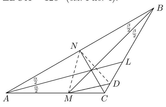 Proof. Draw $M D \| A L$, then $\angle C M D = \frac{\alpha}{2}$. The angle $\angle A L C$ is an external angle of triangle $A L B$, so $\angle A N M = \angle A L C = \frac{\alpha}{2} + \beta$. The angle $\angle B M C$ is an internal angle of triangle $B M C$, so $\angle B M C = \pi - \frac{\beta}{2} - \gamma = \alpha + \frac{\beta}{2}$. Therefore, $\angle B M D = \alpha + \frac{\beta}{2} - \frac{\alpha}{2} = \frac{\alpha + \beta}{2}$. The angle $\angle N M C$ is an external angle of triangle $A N M$, so $\angle N M C = \frac{3 \alpha}{2} + \beta$. Therefore, $\angle B M N = \frac{3 \alpha}{2} + \beta - \frac{\alpha + \beta}{2} - \frac{\alpha}{2} = \frac{\alpha + \beta}{2}$. This means triangles $B M N$ and $B M D$ are congruent, so $N M = M D$ and $\angle M D N = \frac{\pi - (\alpha + \beta)}{2} = \frac{\gamma}{2}$. Therefore, points $N, M, C$ and $D$ lie on the same circle, and since $N M$ and $N D$ are chords subtending equal arcs, $N M = N D$, i.e., triangle $N M D$ is equilateral, so $\frac{\gamma}{2} = \frac{\pi}{3}$. Therefore, $\angle B C A = 120^{\circ}$ (see Fig. 4).