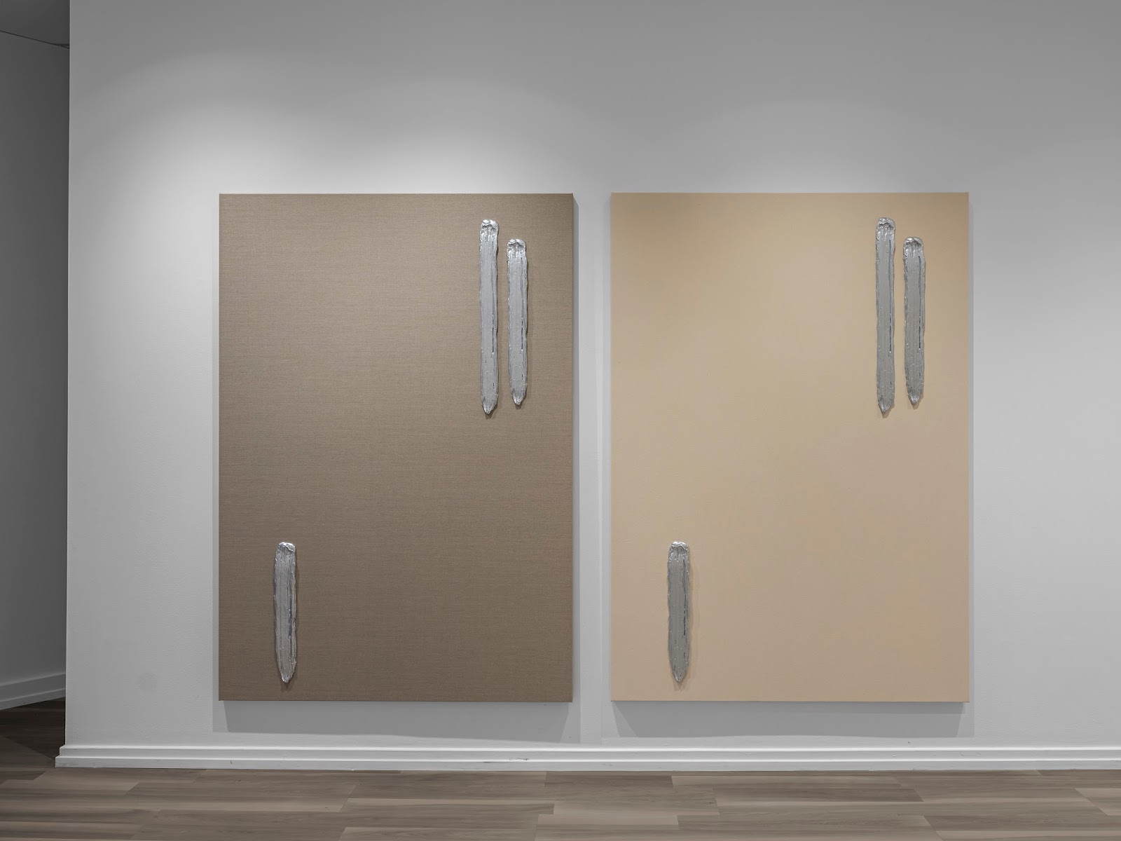 his recent exhibition at michael gibson gallery showcased the best of gorlitz, featuring sophisticated and intelligent painterly contemplations rendered with a largely unparalleled material sensitivity, including two white cabinets with silver handles in a room.